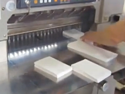ぶ厚い紙束をまとめて切り分ける。紙束の縁を切りそろえる。(断裁機,切り分け,縁揃え,化粧断裁)