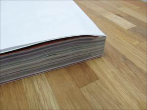 →無線綴じと同じ糊付け製本ですが、より強度のある製本ができる方法です。