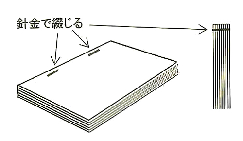 一面に2ページ分を印刷した紙の束を二つ折りし、その折り目に沿って留めます。