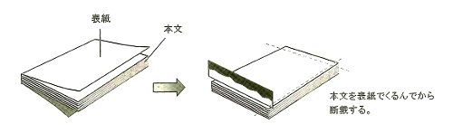 くるみ製本:表表紙・背表紙・裏表紙が一枚に繋がった表紙を、本文をくるむようにくっつけて製本する。